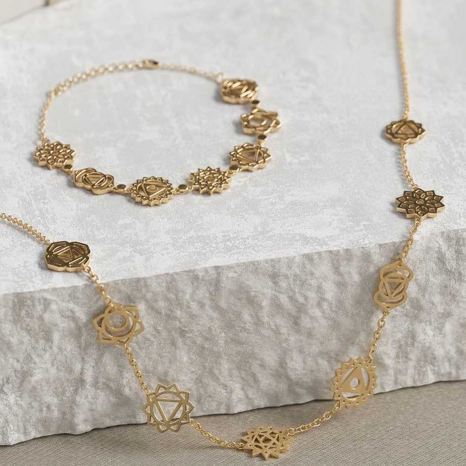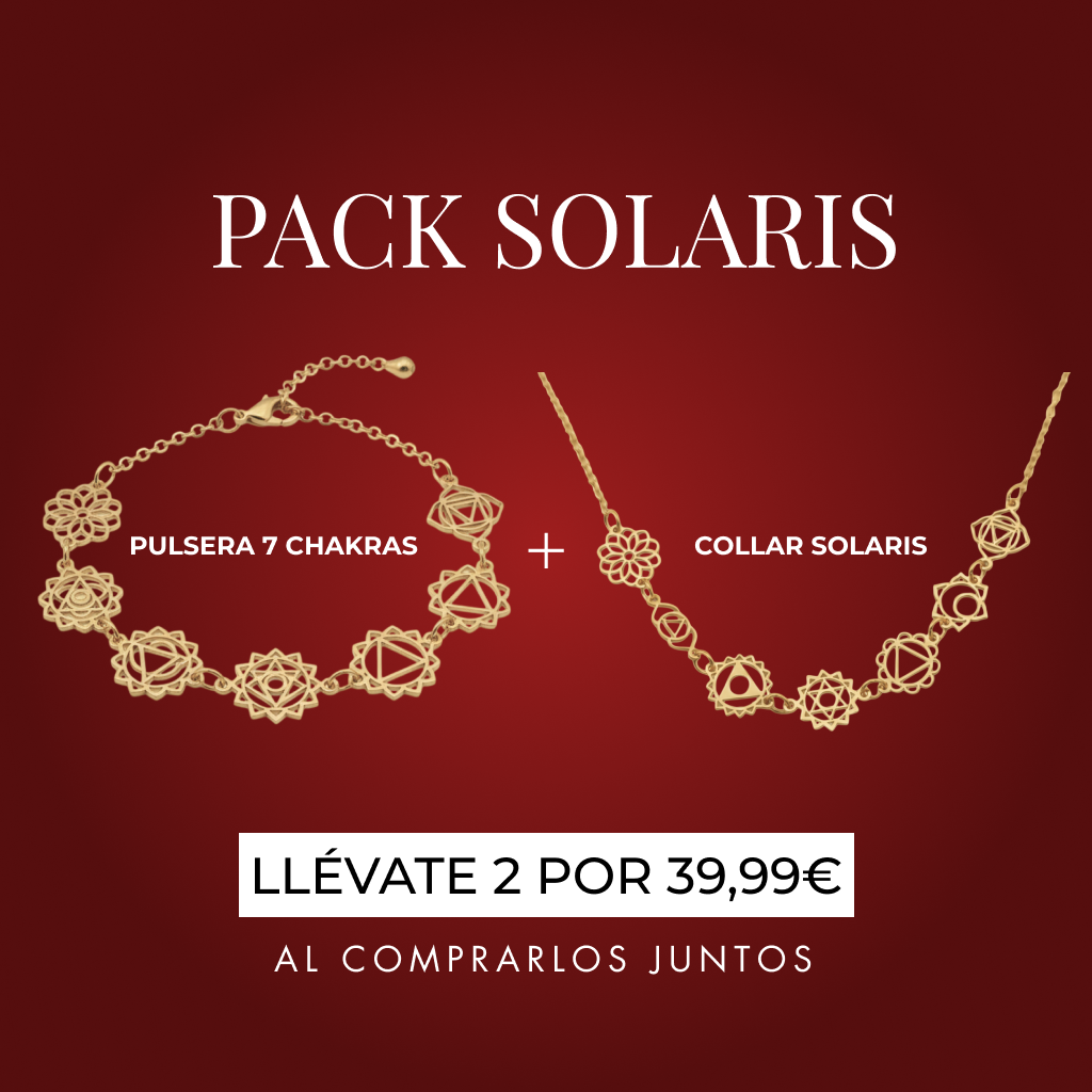 El Pack Solaris Byorum une el Collar Solaris —símbolo de luz interior y poder personal— con la Pulsera 7 Chakras, creando un equilibrio entre fuerza y armonía energética.