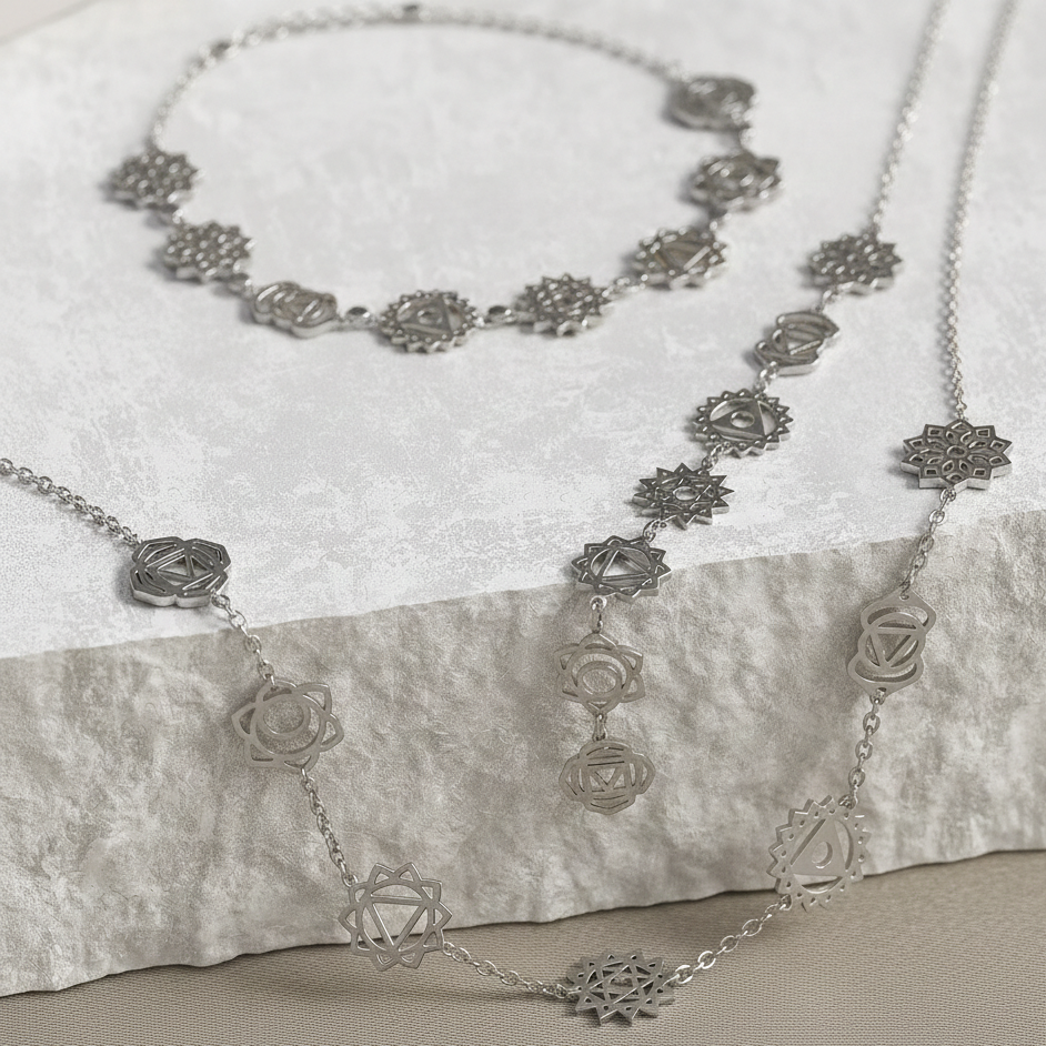 El Pack Energía reúne el Collar 7 Chakras, el Collar Solaris y la Pulsera 7 Chakras, creando una combinación poderosa que une alineación, luz interior y presencia consciente.